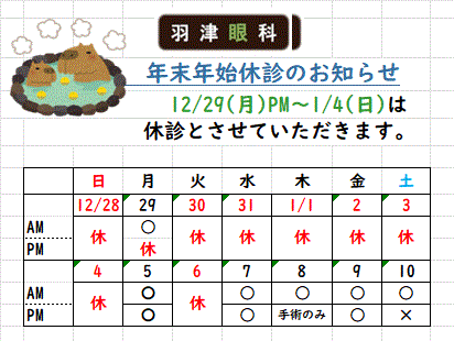 12/29(月)午前は、休日ですが診察いたします。緊急の患者さんを想定しております。定期受診の方は12月早めの受診をお願いいたします。